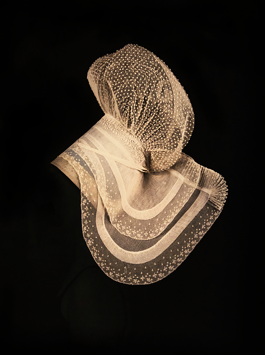 Lace bonnets or caps were all the rage in the 18th century, carrying over into the 19th century. This beautiful handmade lace Charleston bonnet was on display in a French museum and looks so pretty against the black background. Details and the 3D dimensional quality are clearly visible.