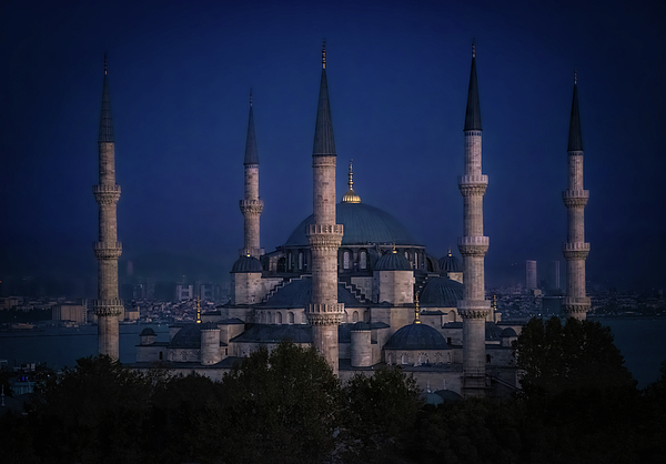 The central dome, crowned with a gleaming gold ornament, dominates the structure, surrounded by a series of smaller domes that form a cascading, tiered effect. The intricate masonry details of the mosque’s exterior are faintly illuminated, allowing subtle patterns to emerge as shadows play along the surface. In the background, the urban landscape of Istanbul comes into view, softened by the evening mist, adding a modern touch to this historic marvel.
