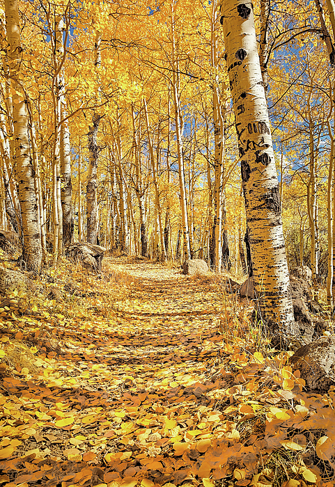 Golden autumn light spills across the aspen groves of Fish Lake, Utah, where slender white trunks rise like sentinels above a forest floor blanketed with fallen leaves. The path, dappled in shades of amber and gold, invites the viewer deeper into the scene, capturing the magic of the season at its height. The striking contrast of the bright foliage against a crisp blue sky gives the landscape a sense of warmth and serenity, making it feel both timeless and alive.