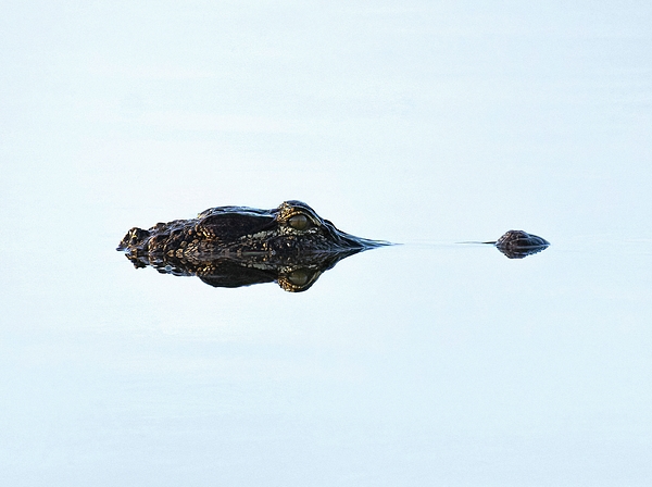 Florida gator lurking barely above the surface of the glassy water, making a nearly perfect reflection of his head and nostrils against a white background.