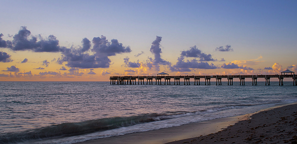 Above, the sky is painted in a delicate gradient, transitioning from a cool blue at the top to warm shades of orange and yellow near the horizon. Fluffy clouds, tinged with pink and purple, float lazily, reflecting the peaceful ambiance of the scene. The pier itself, a popular spot for fishing and leisurely strolls, stands as a serene sentinel, inviting viewers to imagine the gentle sound of waves and the refreshing morning breeze.