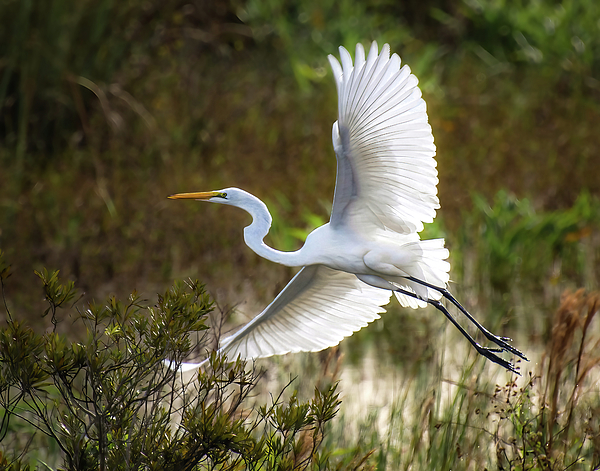 Great white egret in flight, white wings fully outstretched while gliding over the Florida wetlands. Morning sunlight illuminating the white feathers.